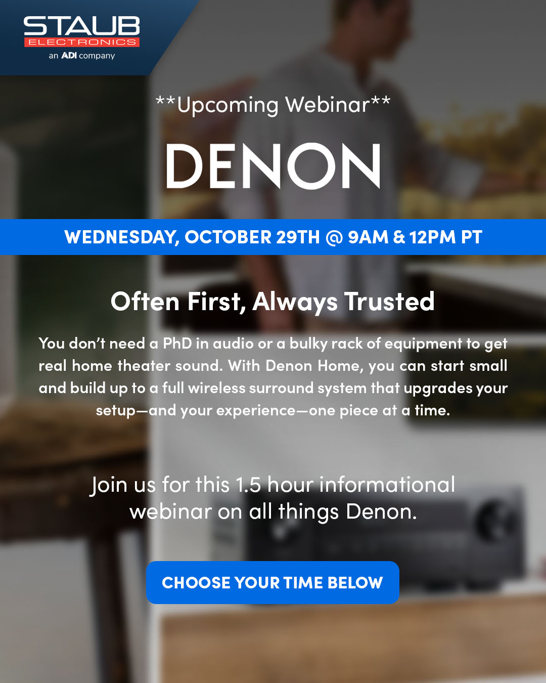 CATEGORY: AUDIO, MEDIA DISTRIBUTION, OUTDOOR, SPEAKERS LEARN MORE SHOP NOW A webinar will be hosted on Wednesday, October 29th, 2025 at 9am PT and 12pm PT for you to learn more about Denon’s family of products. REGISTER (9AM) REGISTER (12PM) in Commercial Audio / Media Distribution / Outdoor AV / Residential Audio / Speakers SharePost tagsDenonYou may also likeStaub Electronics Now Distributing AudioControlRussound MCA-88 RecallRussound AW70V6 Recall